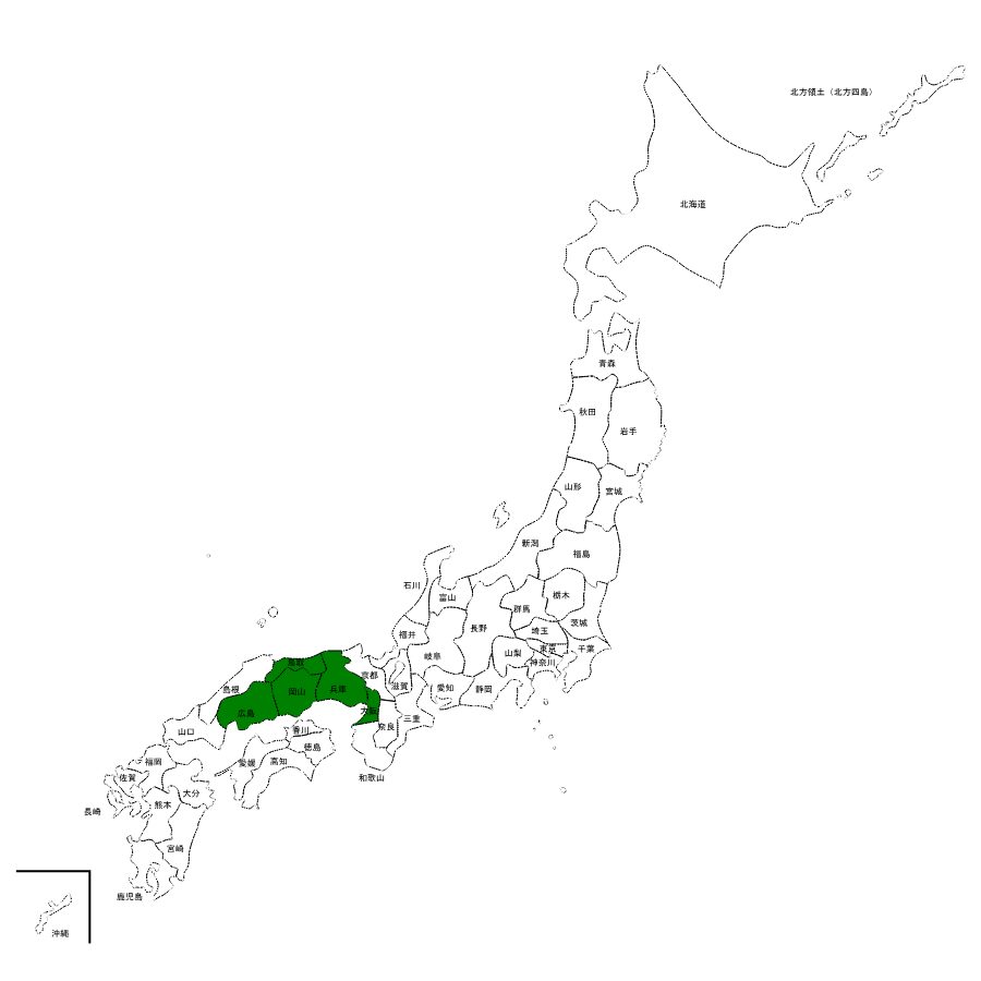 Okayama, Hiroshima, Tottori, Hyogo, and Osaka.